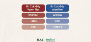 6 Şubat depremleri sonrasında sadece 9 ilden toplam 651.151 kişi göç etti. Bu iller içinde Malatya’nın %9’u, Hatay’ın %8’i ve Kahramanmaraş ile Adıyaman’ın yaklaşık %4’ü başka illere taşındı. Deprem bölgesinin toplam net göç kaybı -290 bin kişi olarak kayda geçti.