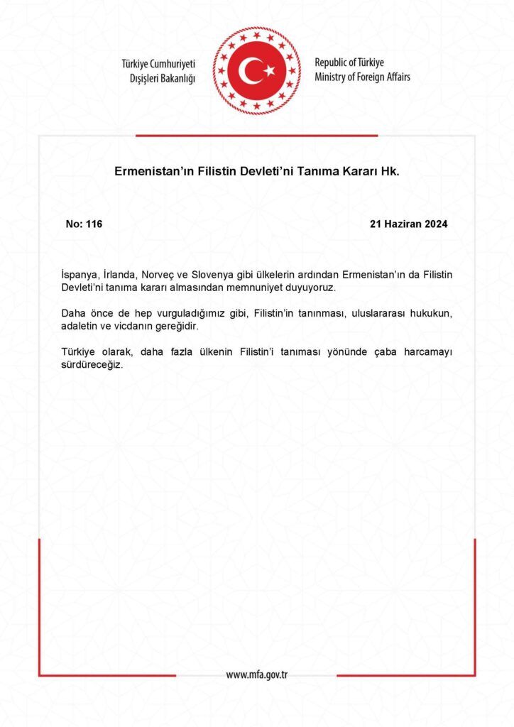 Dışişleri Bakanlığından yapılan açıklamada, "İspanya, İrlanda, Norveç ve Slovenya gibi ülkelerin ardından Ermenistan’ın da Filistin Devleti’ni tanıma kararı almasından memnuniyet duyuyoruz. Daha önce de hep vurguladığımız gibi Filistin’in tanınması, uluslararası hukukun, adaletin ve vicdanın gereğidir. Türkiye olarak daha fazla ülkenin Filistin’i tanıması yönünde çaba harcamayı sürdüreceğiz" denildi.