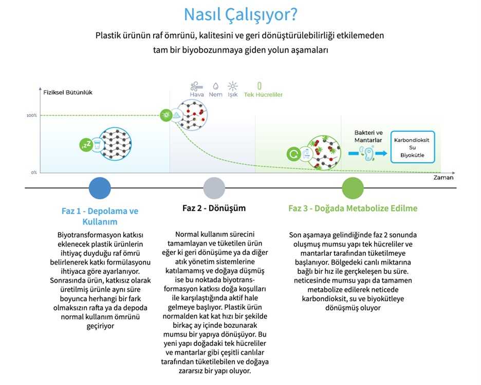 Plastik ürünlerin hemen hepsi 400 yıl gibi çok uzun süreler alsa da moleküler seviyede yıkıma uğrayarak bakteri ve mantarlar tarafından metabolize edilmektedir. Biyodönüşüm katkı teknolojisi ile sağlanan ise bu sürenin ürünün endüstriyel kullanımını ve raf ömrünü etkilemeden birkaç ay gibi çok daha kısa bir süreye indirgenmesi için doğal süreçleri hızlandırmaktır.