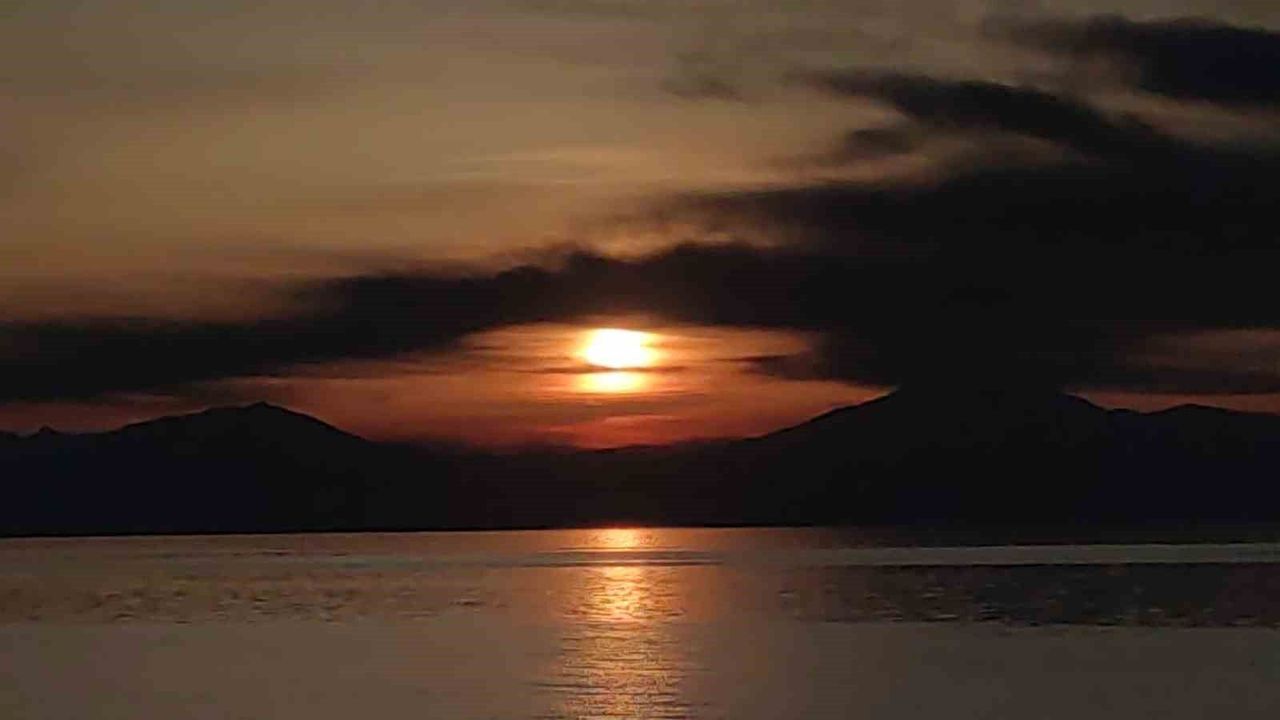 Doğu’nun incisi Van’da bugün, güneşin batışıyla birlikte gökyüzünde adeta bir renk cümbüşü yaşandı. Van Gölü üzerinden süzülerek batan güneş, yerini gümüş bir tepsi gibi doğan aya bıraktı. Akşam saatlerinde Van Kalesi ve Edremit sahil şeridinde bir araya gelen vatandaşlar, gün batımının eşsiz kızıllığına tanıklık etti. Güneşin Van Gölü’nün sodalı sularına vuran son ışıkları, ufuk çizgisini ateş kırmızısına boyadı. Güneşin kaybolmasıyla birlikte Erek Dağı’nın kuzeyin yükselen dolunay, kentin üzerine bir ışık huzmesi yaydı.