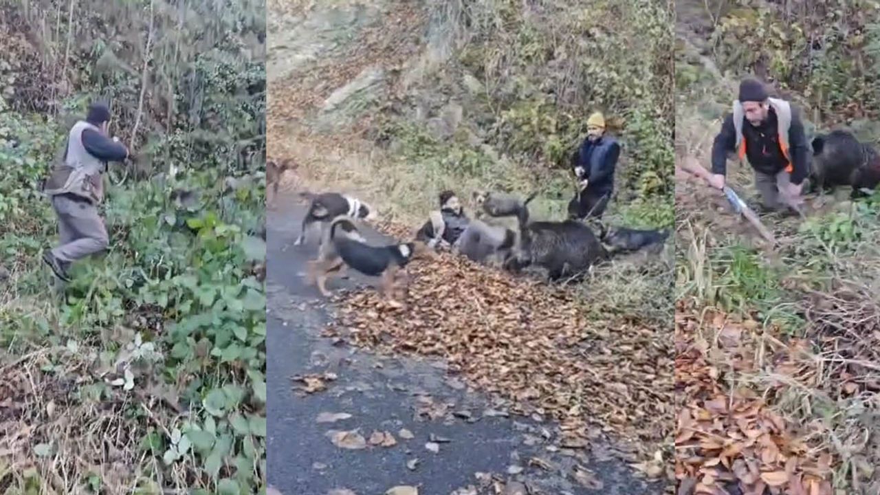 Trabzon’da ava çıkan avcılar karşılaştıkları domuzun saldırısına uğradı. O anlar cep telefonu kamerasına yansırken, yaşlı avcı arkadaşlarının müdahalesi ile domuzun saldırısından ağır bir yara almadan kurtuldu.