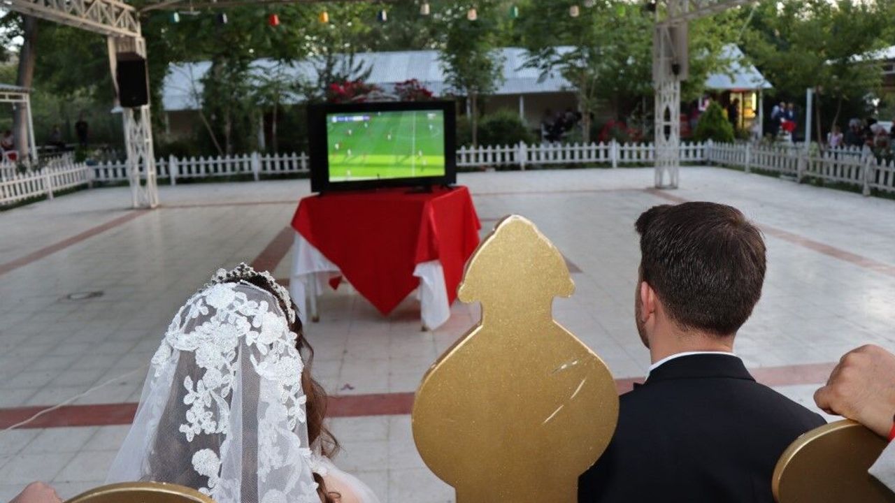 Genç çift düğün salonu pistine televizyon kurdurup milli maçı seyretti. Damat Uğur Uysal, “Düğünümüzü yarıda kestik ve arkadaşlarımla milli maçımızı izledik. Milli gururumuzu yaşıyoruz” dedi. Çiçeği burnundaki gelin Nurhan Uysal da, “Milli takımımıza başarılar diliyorum. Bugün düğünümüze denk geldi ve çok güzel bir an yaşıyoruz. Hem düğün hem de maçımızı izliyoruz” şeklinde konuştu.