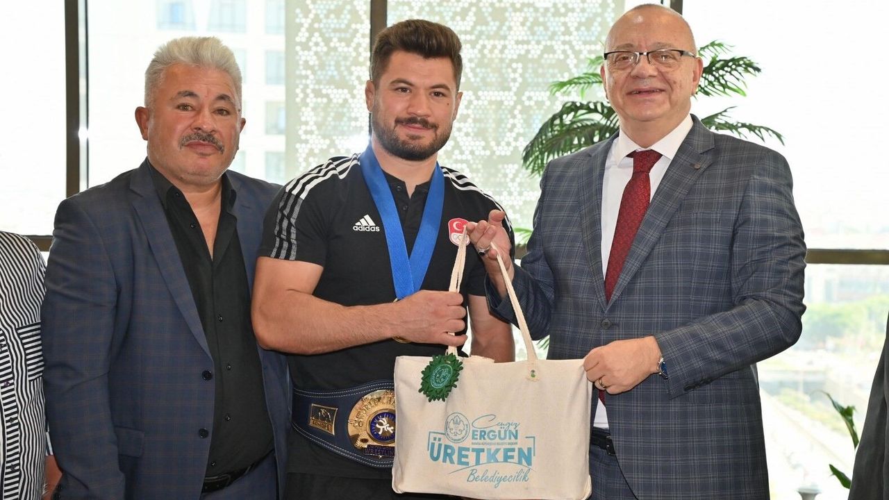 Sırbistan’ın başkenti Belgrad’da düzenlenen 2023 Dünya Güreş Şampiyonası’nda grekoromen stil 87 kiloda altın madalya kazanan ve olimpiyat kotası elde eden Akhisarlı milli sporcu Ali Cengiz, Manisa Büyükşehir Belediye Başkanı Cengiz Ergün’ü ziyaret etti. Başkan Ergün, İstiklal Marşı’nı tüm dünyaya dinleten Ali Cengiz’i tebrik etti, başarılarının devamını dileyerek, altınla ödüllendirdi.
