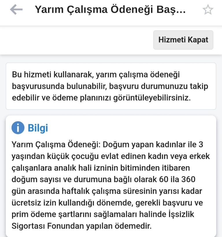 Bu hizmeti kullanarak, yarım çalışma ödeneği başvurusunda bulunabilir, başvuru durumunuzu takip edebilir ve ödeme planınızı görüntüleyebilirsiniz.