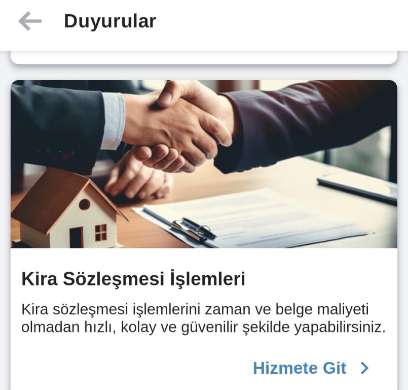 Bu hizmeti kullanarak; sahibi / hissedarı olduğunuz taşınmazlar için kira sözleşmesi oluşturabilir, kiracı veya kefil olarak hazırlanan kira sözleşmelerine onay verebilirsiniz. Bu hizmet gerçek kişiler arasında düzenlenecek kira sözleşmeleri için hazırlanmıştır. İşlem tarafları arasında tüzel kişi bulunması halinde bu hizmet sunulamayacaktır.