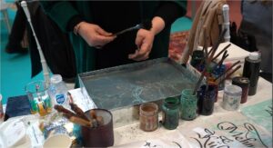Taştan, fuarda aynı zamanda kaligrafi sanatıyla da ortak çalışmalar yaptıklarını belirterek, “Çocukların isimlerini güzel yazıyla yazıyoruz, sonra üzerine ebru yapıyoruz. Köy okullarını ziyaret ederek bu sanatları gençlerimize tanıtıyoruz. Gerçekten sabrı öğreten, kişisel gelişime katkı sağlayan bir sanat dalı,” dedi.
