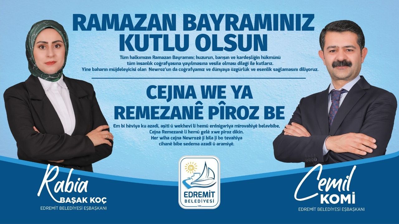 Edremit Belediye Eşbaşkanları Rabia Başak Koç ve Cemil Komi, Ramazan Bayramı dolayısıyla ortak bir kutlama mesajı yayımladı. Kürtçe ve Türkçe olarak paylaşılan mesajda, bayramın evrensel barışa ve huzura vesile olması temenni edildi.