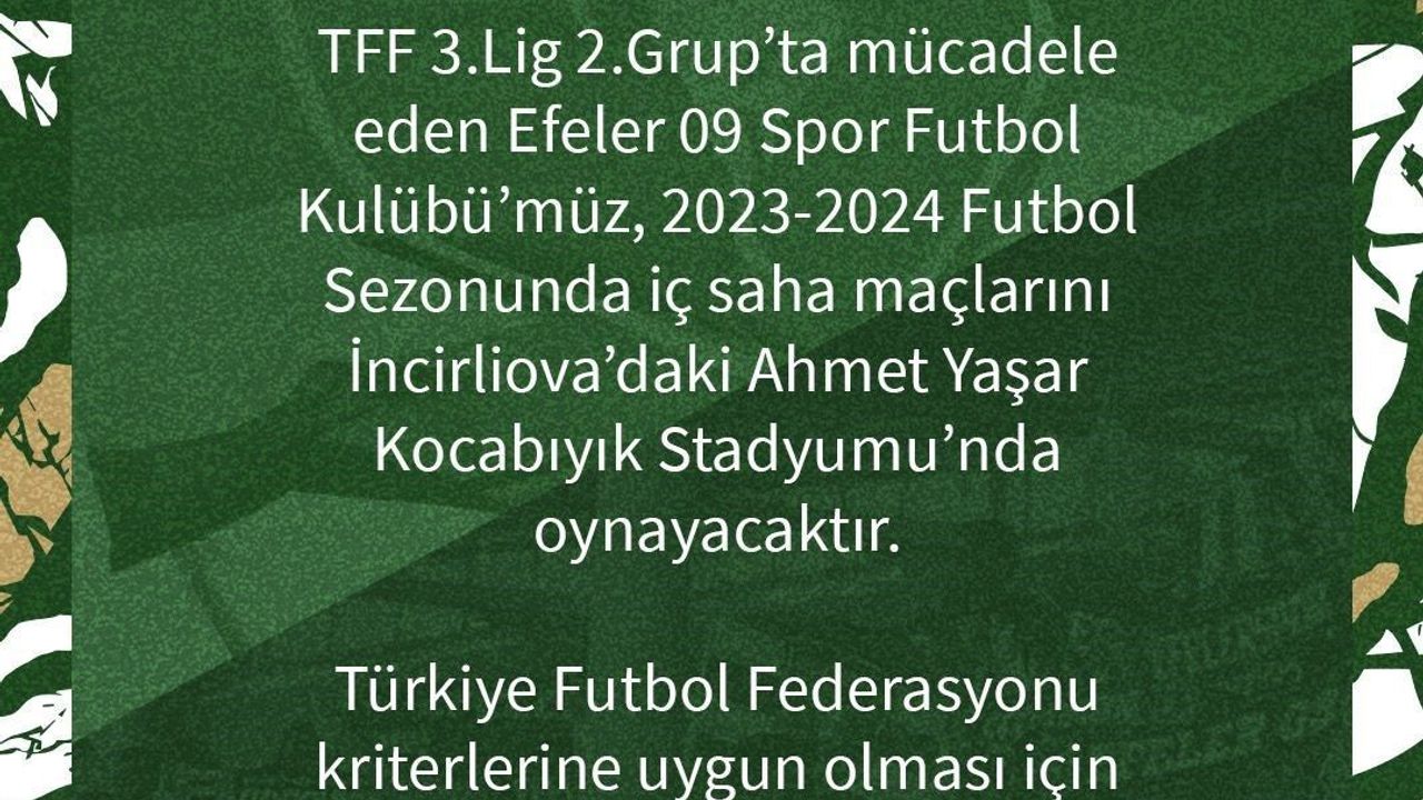 Efeler 09 SFK Yönetim Kurulu tarafından yapılan açıklamada, "Türkiye Futbol Federasyonu kriterlerine uygun olması için gerekli çalışmaları yaparak bize destek olan İncirliova Belediye Başkanı Aytekin Kaya’ya teşekkür ederiz" ifadelerine yer verildi. Yeşil beyazlı ekip ilk iç saha maçını 17 Eylül Pazar günü oynayacak.