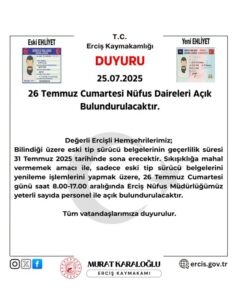 “Bilindiği üzere eski tip sürücü belgelerinin geçerlilik süresi 31 Temmuz 2025 tarihinde sona erecektir. Sıkışıklığa mahal vermemek amacı ile, sadece eski tip sürücü belgelerini yenileme işlemlerini yapmak üzere, 26 Temmuz Cumartesi günü saat 08.00-17.00 aralığında Erciş Nüfus Müdürlüğümüz yeterli sayıda personel ile açık bulundurulacaktır.”