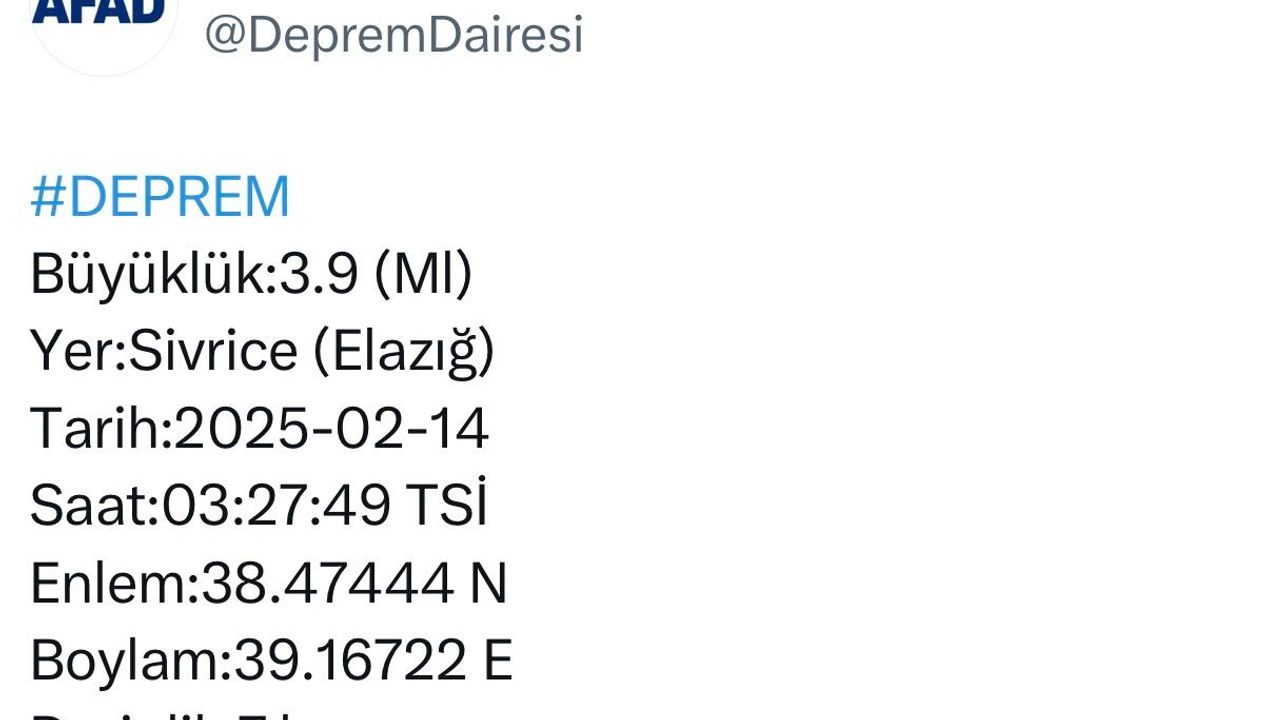 Afet ve Acil Durum Yönetimi Başkanlığı Deprem Dairesi Başkanlığından alınan bilgiye göre, saat 03:27’de merkez üssü Elazığ’ın Sivrice ilçesinde 3.9 büyüklüğünde deprem meydana geldi. Yerin yaklaşık 7 kilometre derinliğinde meydana gelen depremle ilgili olumsuz bir durum yaşanmadığı öğrenildi.