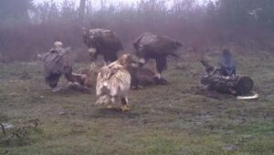 "Ülkemizde bugüne kadar tespit edilen on kartal türünden biri olan ve son derece iri olan kaya kartalı ayrıca Türkiye’de dağılım gösteren 4 akbaba türünden biri olan keşiş akbabası diye de adlandırılan kara akbabaları ve kuzgun 5. Bölge Müdürlüğümüze bağlı Afyonkarahisar Akdağ Milli Parkımızda aynı karede foto kapanlarımıza ve objektiflerimize yakalandı. Yaban Hayatını koruyor ve izliyoruz" ifadelerine yer verildi.