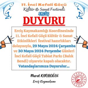 Yayınlanan duyuruda, “Erciş Kaymakamlığı Koordinesinde 11. İnci Kefali Göçü Kültür ve Sanat Etkinlikleri, Festival hazırlıkları dolayısıyla, 29 Mayıs 2024 Çarşamba ve 30 Mayıs 2024 Perşembe günleri İnci Kefali Göçü Tabiat Parkı (Balık Bendi) ziyarete kapalı olacaktır” ifadeleri kullanıldı.