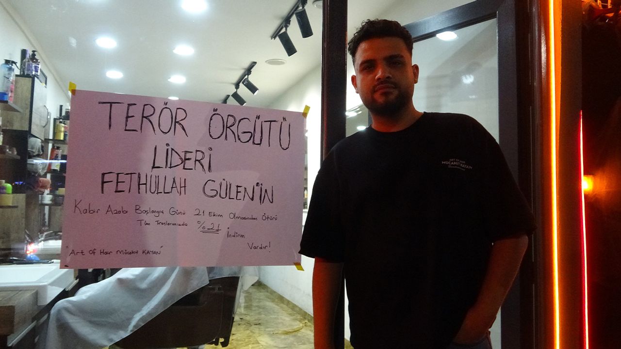 3 yıldır erkek kuaförlüğü yapan Mücahit Kayan, dükkanının camına astığı “Terör örgütü lideri Fetullah Gülen’in kabir azabı başlangıç günü 21 Ekim olmasından ötürü tüm tıraşlarımızda yüzde 21 indirim vardır” şeklindeki yazı ile indirim kampanyası başlattı.
