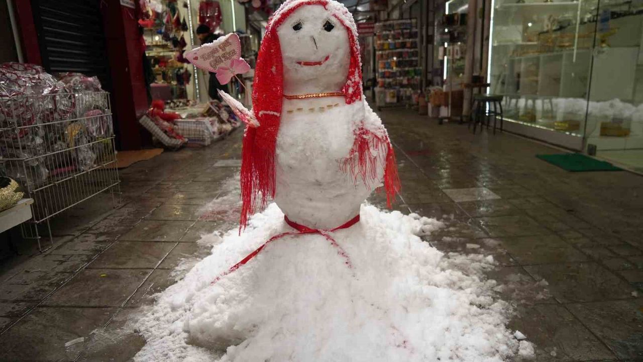 Samsun’da kına ve düğün malzemelerinin satıldığı çarşıdaki esnaf, yoğun kar yağışını fırsat bilerek ‘kardan gelin’ yaptı. Kına gecesi için süslenen kardan gelin, görenlerin ilgisi çekti.