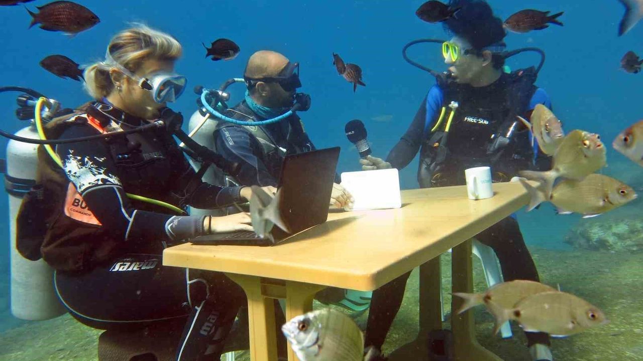 Fethiye’de bir dalış okulunun işletmeciliğini yapan Önder Diktaş ile beraberindeki Aydın Tanal ve Melisa Harless, Dalyan Koyu açıklarında 5 metre derinliğe dalış gerçekleştirdi. Gerçekleştirdikleri dalışta dikkat çeken bir etkinlik gerçekleştiren dalgıçlar, su altında kurdukları masanın etrafında oturarak, turizm sezonu değerlendirme toplantısı gerçekleştirdi. Dalgıçların bu anları ise su altı kamerasıyla kaydedildi. Bir dalgıç diğerinin sorularını cevaplandırırken, diğer dalgıç da bilgisayara notlarını aldı. Dalış Eğitmeni Önder Diktaş, yaptıkları bu etkinlikle Turizm Haftasını kutladıklarını belirterek, "Sezon boyunca yerli ve yabancı tüm misafirlerimizi dalış için bekliyoruz. Bu sezonda farklı etkinliklere imza atmayı planlıyoruz. Amacımız, dalışı Türkiye’de tanıtmak ve sevdirmek" dedi.