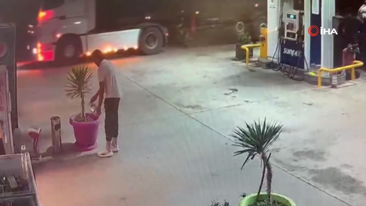 03 HK 184 plakalı kamyonet ile istasyona gelen şüphelinin aldığı 5 litrelik pet şişelerdeki suları önce çiçek saksısına döktüğü ardından da pompaya geçip benzin aldığı görüldü. Şüpheli şahsın sık sık telefon ile görüşmesi dikkat çekti.