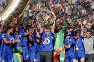 ABD’de düzenlenen FIFA Kulüpler Dünya Kupası finalinde İngiliz ekibi Chelsea ile Fransız temsilcisi Paris Saint-Germain, MetLife Stadyumu’nda karşı karşıya geldi. Avustralyalı hakem Alireza Faghani’nin yönettiği mücadelenin 22. dakikasında Cole Palmer perdeyi açan isim oldu ve Chelsea’yi 1-0 öne geçirdi. 30. dakikada tekrar sahneye çıkan Cole Palmer skoru 2-0’a getiren golü kaydetti. 43. dakikada Joao Pedro’nun golüyle İngiliz ekibi soyunma odasına 3-0 önde girdi. PSG, 85. dakikada Joao Neves’in gördüğü kırmızı kartla mücadeleyi 10 kişi tamamlarken, maç Chelsea’nin 3-0 üstünlüğü ile sona erdi. Bu sonuçla İngiliz ekibi kupayı müzesine götürdü.