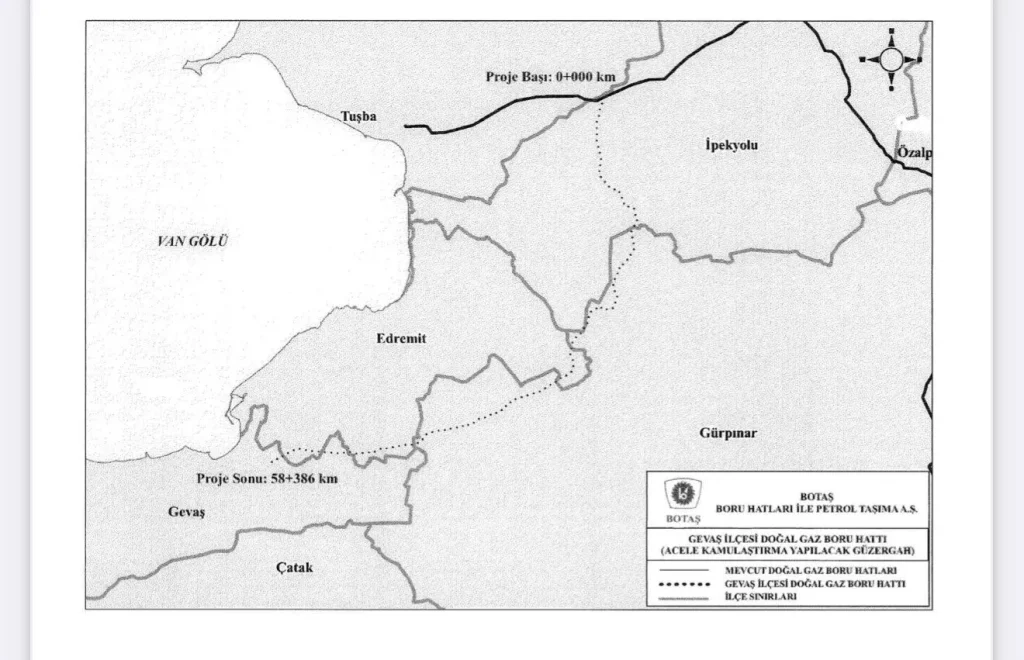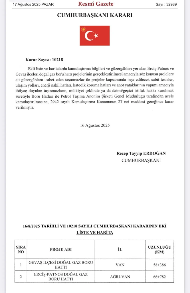 Resmî Gazete’de yayımlanan Cumhurbaşkanlığı Kararı ile Erciş-Patnos ve Gevaş Doğal Gaz Boru Hattı projeleri kapsamında hat güzergahına isabet eden taşınmazlar Petrol Taşıma Anonim Şirketi (BOTAŞ) tarafından acele kamulaştırılacak. Projede boru hatları, sabit tesisler, ulaşım yolları ve enerji nakil hatları gibi yapılar yer alacak.