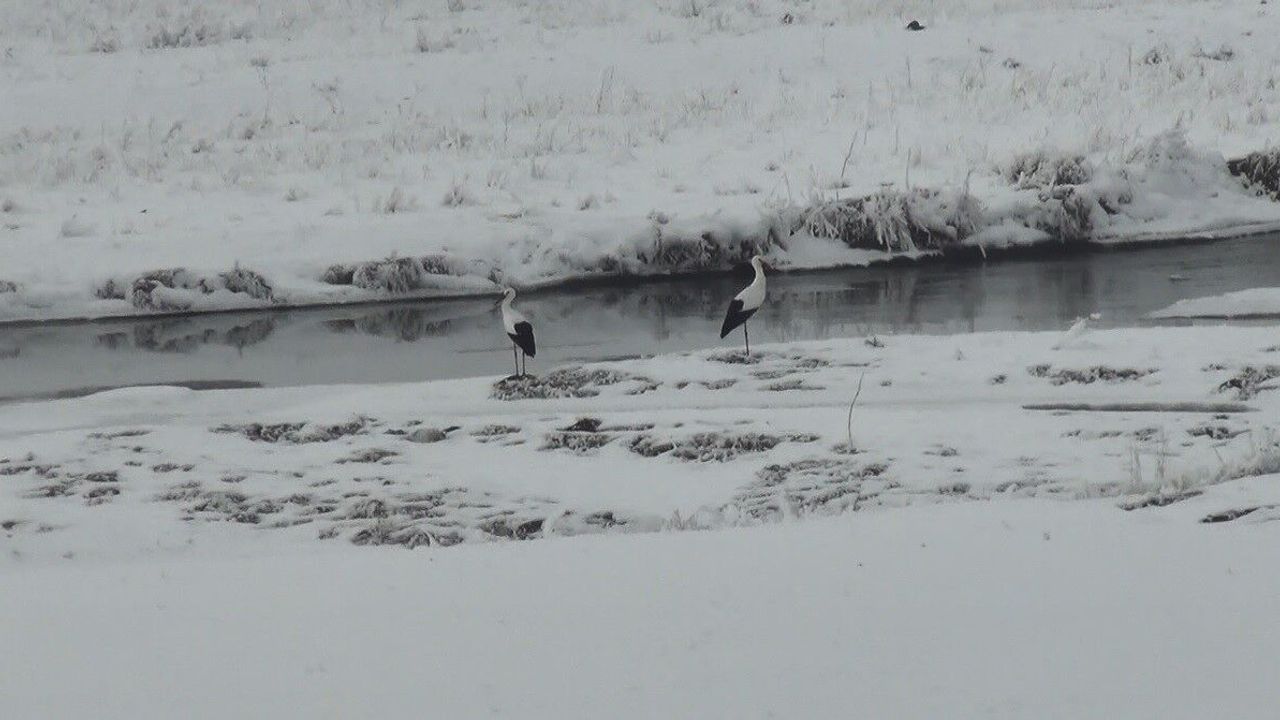 Kars’ta kış şartlarının etkisini göstermesiyle birlikte göç edemeyen leylekler, karla kaplı doğada görüntülendi. Kars Çayı’nın kenarında eksi 15 derece soğukta bölgeden ayrılmayan leylekler, çevredeki vatandaşların dikkatini çekti.