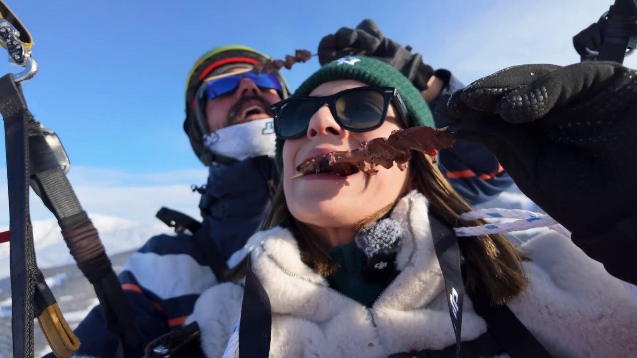Palandöken’in muhteşem manzarasının tadını yamaç paraşütü yaparken çıkarmak isteyen adrenalin tutkunları, bu anları kaydedip insanlarla paylaşmayı da ihmal etmiyor. Yamaç paraşütü heyecanını ve deneyimini ilk kez yaşayan Neşe Durdi, adrenalin tutkusunu biraz daha ileri taşıdı. 3100 rakımlı Palandöken Dağı zirvesinden yamaç paraşütü hocası Yusuf Okuyucu ile bu deneyimi yaşayan Neşe Durdi, yanında getirdiği cağ kebabını gökyüzünde süzülerek yedi.