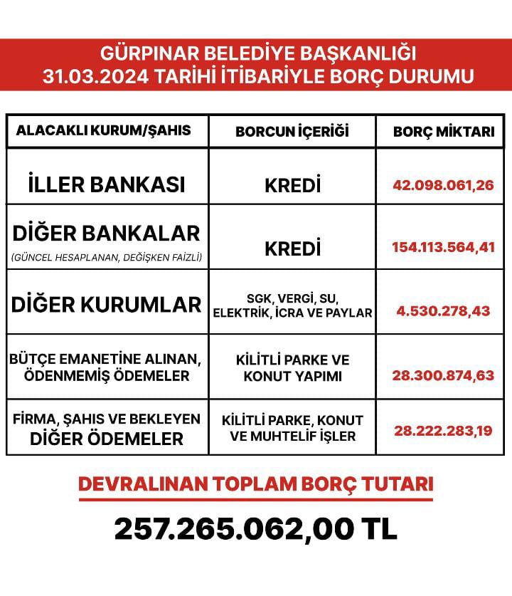Gürpınar Belediyesinin ilk meclis toplantısının ardından borç miktarı da açıklandı. Açıklanan verilere göre Belediyenin toplam 257 milyon 265 bin 62 kuruş borcunun olduğu açıklandı.