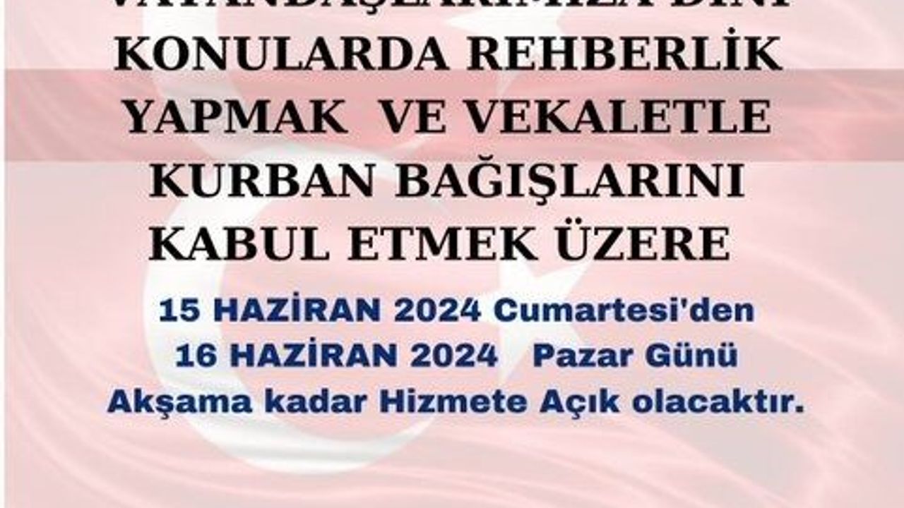 Müftülük yaptığı paylaşımda; “İlçe müftülüğümüz vatandaşlarımıza dini konularda rehberlik yapmak ve vekaletle kurban bağışlarını kabul etmek üzere 15 Haziran 2024 cumartesinden 16 Haziran 2024 Pazar günü akşama kadar hizmete açık olacaktır” ifadeleri kullanıldı.