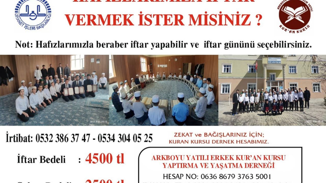 Müftülük, Arkboyu Yatılı Erkek Kur’an Kursu’nda eğitim gören hafız öğrencilere iftar ve sahur ikramında bulunarak sevap kazanmak isteyenlerin desteğini bekliyor.