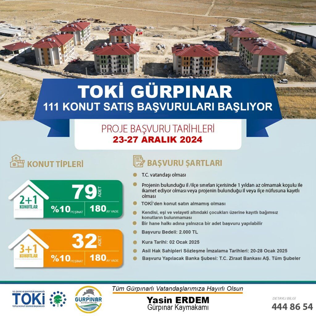 Toplu Konut İdaresi Başkanlığı (TOKİ) tarafından hayata geçirilen Van Gürpınar Kızığ Mahallesi 111 Konut Projesi kapsamında toplam 111 adet konut kuralı satış yöntemiyle vatandaşlara sunulacak. Proje kapsamında 79 adet 2+1 ve 32 adet 3+1 daire yer alıyor.