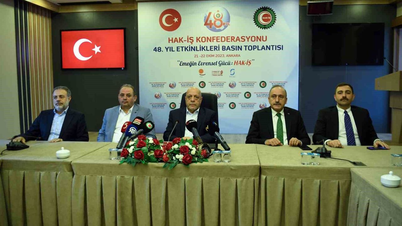 Hak-İş Konfederasyonu Genel Başkanı Mahmut Arslan Konfederasyonun 48’inci yıldönümü çerçevesinde, Hak-İş Genel Merkezi’nde gündeme dair basın açıklamasına bulundu. Arslan, Filistin-İsrail olaylarının yanı sıra çalışma hayatını yakından ilgilendiren asgari ücret görüşmeleri, kıdem tazminatı ve toplu sözleşmelerle ilgili konuştu.