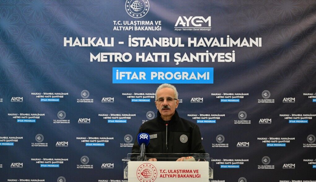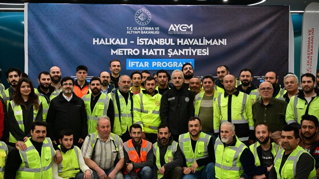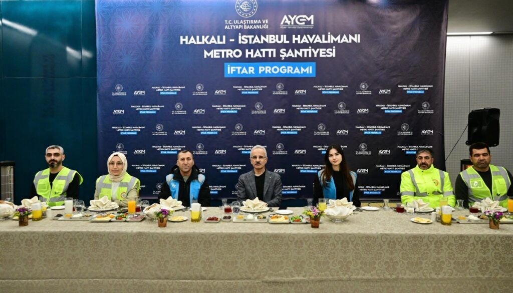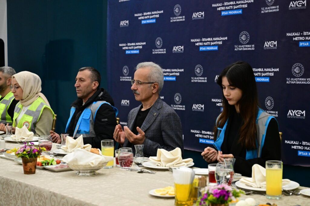 Ulaştırma ve Altyapı Bakanı Abdulkadir Uraloğlu, Halkalı-İstanbul Havalimanı Metro Hattı Şantiyesi’nde çalışan işçiler ile iftar programında bir araya geldi. Burada konuşan Uraloğlu, “Sizlerin alın teri, fedakarlığı ve azmiyle ilerleyen Halkalı- İstanbul Havalimanı Metro Hattımızın Halkalı Stadyum İstasyonu şantiyesinde sizlerle yan yana iftar açmak benim için gerçekten çok kıymetli. Mübarek Ramazan ayının bu bereketli sofrasında, sizlerle bir araya gelmekten büyük memnuniyet duyuyorum. Biliyorsunuz Ramazan, sadece aç ve susuz kalmak değil, aynı zamanda gönüllerimizi de arındırmak, birlik ve beraberliğimizi pekiştirmek demektir.” ifadelerini kullandı.