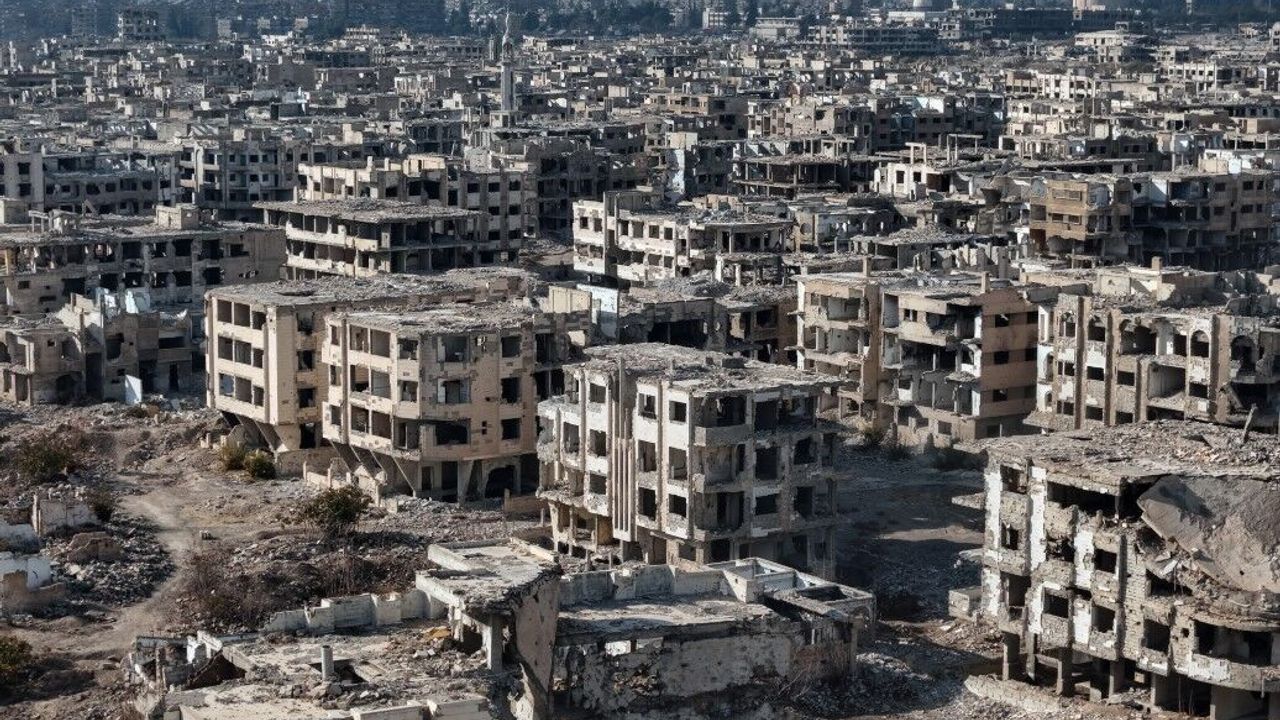 Enkaz yığınlarıyla dolu mahallelerde, savaşın yıkıcı izleri gözler önüne seriliyor. Tüm binaların enkaza döndüğü dikkat çekerken cami minarelerinin de yıkıldığı görülüyor.