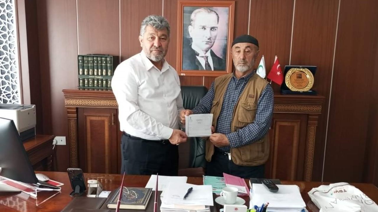 Müftüsü Eroğlu, hayır sahibi Halis Erarslan’a Kur’an-ı Kerim hediye ederek teşekkür etti.