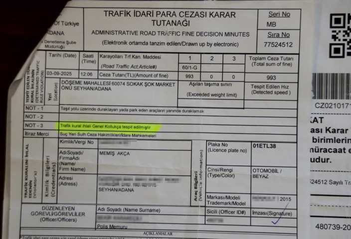 Adana’da yaşayan Memiş Akça, geçtiğimiz eylül ayında merkez Seyhan ilçesi Döşeme Mahallesi’nde 01 ETL 38 plakalı otomobiline, “hatalı park” gerekçesiyle 993 TL idari para cezası kesildi. Ancak cezayı yazan polis memurunun trafik polisi olmadığını fark eden avukat kızı Nazan Akça Subaşı, duruma itiraz ederek Adana 6. Sulh Ceza Hakimliği’ne dava açtı.