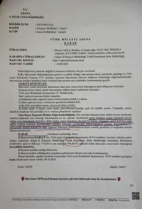 Adana’da avukat Nazan Akça Subaşı, babasına trafik polisi olmayan bir memur tarafından kesilen 993 TL’lik cezanın iptali için dava açtı. Mahkeme, “Genel kolluk trafik cezası kesemez” diyerek cezayı iptal etti. Karar, Türkiye genelinde emsal niteliği taşıyor.