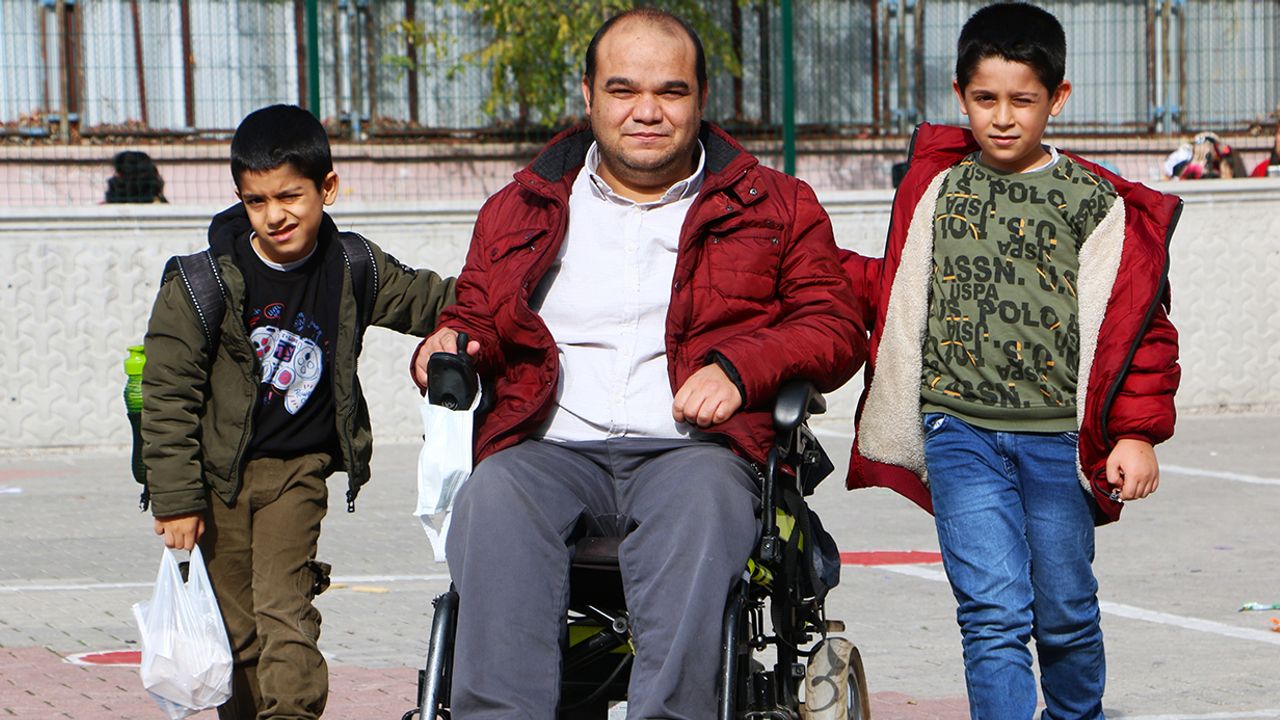 4 çocuğundan 4. sınıf öğrencisi Beytullah ve 1. sınıf öğrencisi Emrullah’ı her gün akülü sandalyesiyle okula götürüp getiren Güngür, yürekleri ısıtan görüntülerle örnek davranış sergiliyor.
