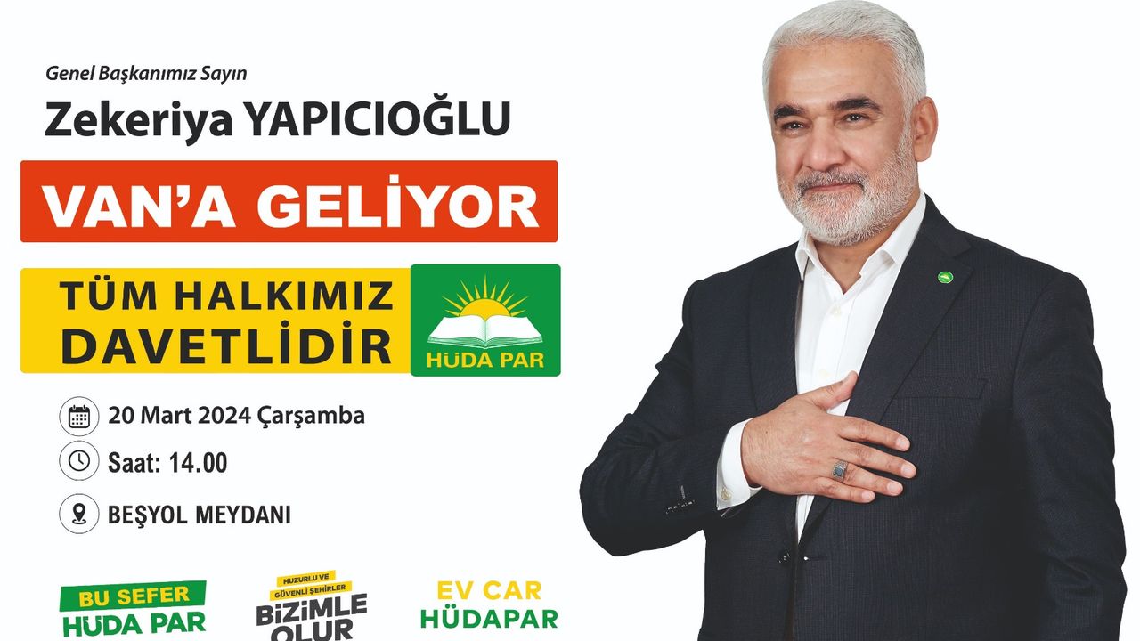 Hür Dava Partisi (HÜDA PAR) Genel Başkanı Zekeriya Yapıcıoğlu, bir dizi programa katılmak üzere Van’a gelecek.