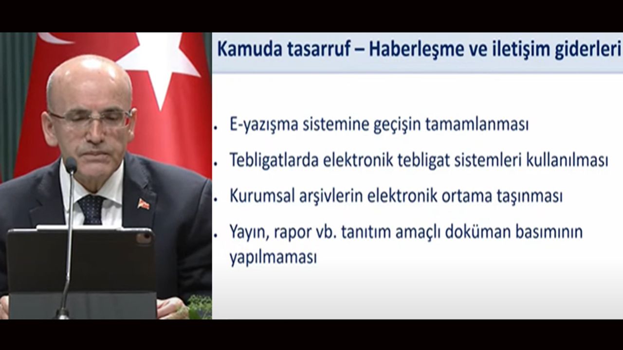Cumhurbaşkanı Yardımcısı Cevdet Yılmaz ve Hazine ve Maliye Bakanı Mehmet Şimşek, kamuda tasarruf dönemi için alınan tedbirleri açıkladı. Planlanan harcama tedbirlerinin üç temel ekseninde; kamuda tasarruf, bütçe harcamalarında disiplin ve kamu yatırımlarında verimlilik yer alıyor. Taşıt kullanımından kamu binalarına, istihdamdan idari yapılanmaya, yurt dışı görevlendirmeden enerji ve atık yönetimine kadar birçok tedbiri içeren kamuda tasarruf planında, “haberleşme giderleri” için alınan önlemler ise önemli bir yer tutuyor. Bu kapsamda; kamuda haberleşme ve iletişim giderlerinde dijitalleşme yoluyla tasarrufa gidilmesi planlanıyor. Öne çıkan haberleşme ve iletişim tedbirleri arasında; kamuda elektronik yazışmaya geçişin tamamlanması, fiziksel arşivlerin elektronik ortama taşınması ve elektronik tebligat sistemi kullanımının yaygınlaştırılması maddeleri yer alıyor. Tedbirler kapsamında; yayın, rapor ve benzeri tanıtım amaçlı dokümanlar da fiziki olarak değil elektronik ortamda paylaşılacak. Uygulanacak tedbirlerle birlikte bütçe açığı, faiz yükü, kamu borçlanması ve cari açıkta ciddi azalma olacağı öngörülüyor. Tedbirlere uyulmadığının tespiti durumunda Cumhurbaşkanlığı ve ilgili idareler, aykırılık yapan kuruma idari yaptırım ve para cezası uygulayabilecek.