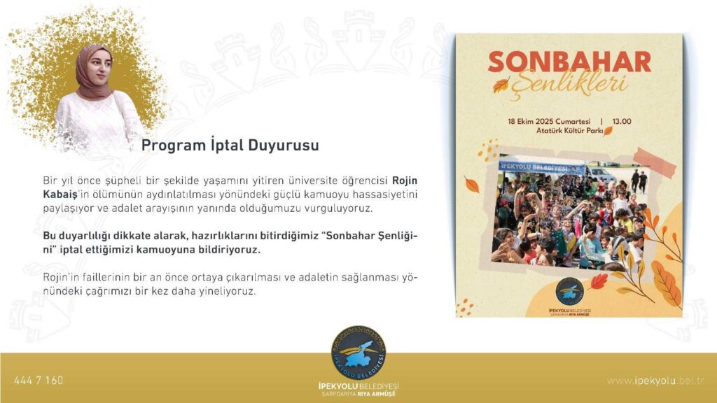 “Bir yıl önce şüpheli bir şekilde yaşamını yitiren üniversite öğrencisi Rojin Kabaiş’in ölümünün aydınlatılması yönündeki güçlü kamuoyu hassasiyetini paylaşıyor ve adalet arayışının yanında olduğumuzu vurguluyoruz. Bu duyarlılığı dikkate alarak, hazırlıklarını tamamladığımız ‘Sonbahar Şenliği’ni iptal ettiğimizi kamuoyuna bildiriyoruz. Rojin’in faillerinin bir an önce ortaya çıkarılması ve adaletin sağlanması yönündeki çağrımızı bir kez daha yineliyoruz.”