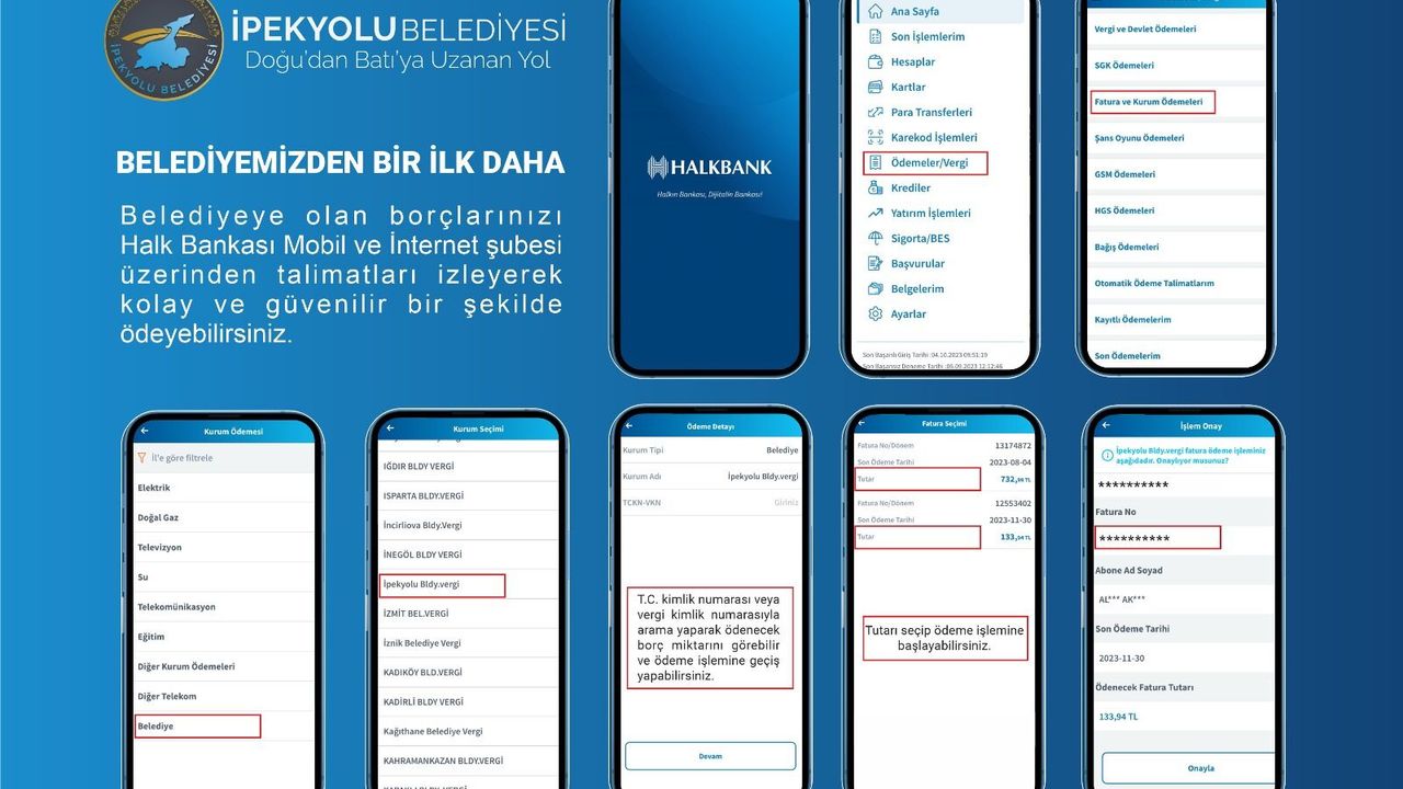 Bilgi İşlem Müdürlüğü ile ilk olarak Halkbankası arasında yürütülen projeye istinaden, mobil internet bankacılığı üzerinden ödeme yapmak isteyen vatandaşlar ödemeler/vergi kısmından fatura ve kurum ödemelerini daha sonra belediye butonundan İpekyolu Bldy. Vergi kısmını tercih etmeliler. Ardından TC Kimlik No bilgileri girildikten sonra çıkan borç tutarı kadar tutarı seçip onaylayarak ödeme işlemeni online olarak gerçekleştirebilirler.