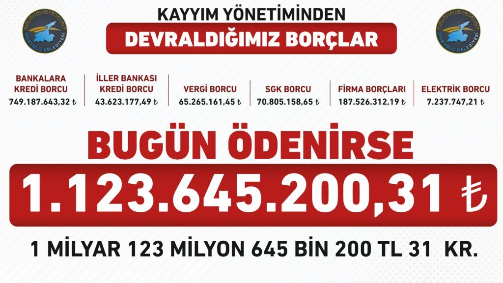 6 Nisan’da mazbatalarını alan eşbaşkan Cevdet Altındağ ve Canan Uzunay, belediyeyi 1 milyar 123 milyon 645 bin 200 lira 31 kuruş borçla devraldılar. Bugün itibariyle, belediye ve şirketine ait borçları belediye binasına asıldı.