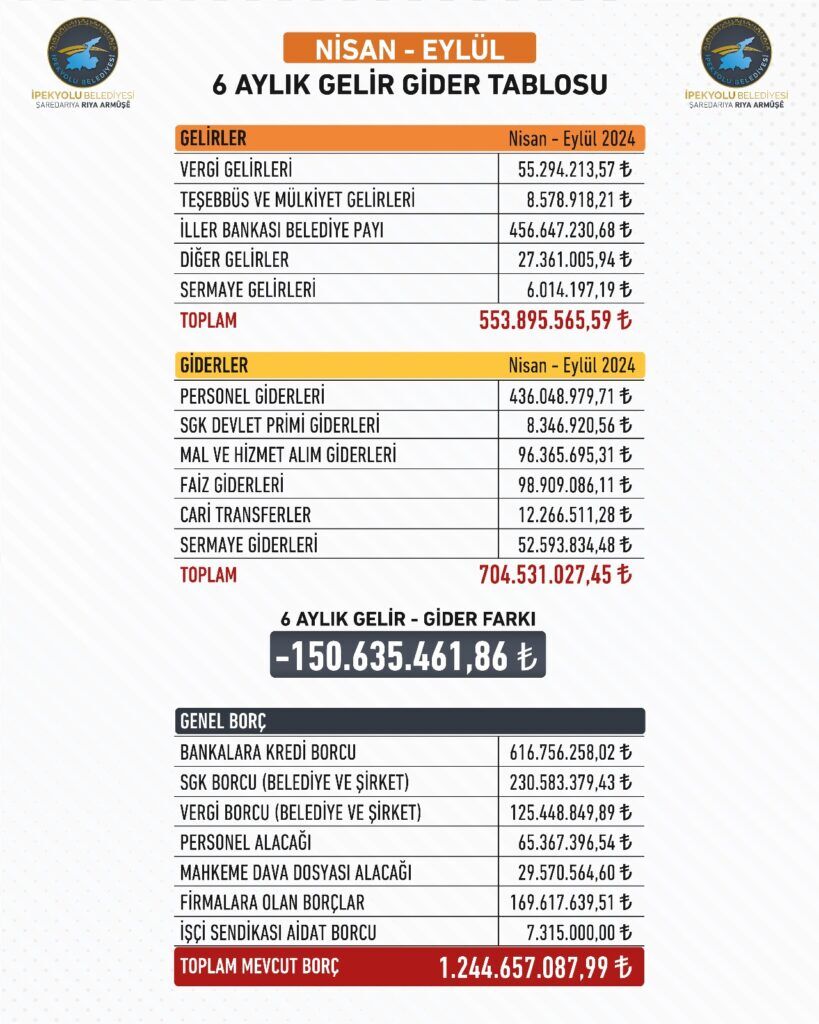 İŞTE İPEKYOLU BELEDİYESİNİN 6 AYLIK GELİR-GİDER TABLOSU...