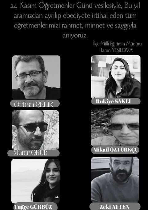 İlçe Milli Eğitim Müdürlüğü tarafından paylaşılan görselde, vefat eden öğretmenlerin fotoğrafları ve isimleri yer aldı. Öğretmenlik mesleğinin toplum için taşıdığı değer vurgulanırken, eğitim camiasının kayıplarının derin bir üzüntüyle karşılandığı ifade edildi.