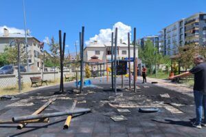 İpekyolu Belediyesi Eşbaşkanı Cevdet Altındağ, oyun grubu ve kauçuk zemini yanan parkta incelemelerde bulunarak zarar gören çocuk oyun alanını eski haline getirmek için hemen çalışmalara başlanacağını belirtti.