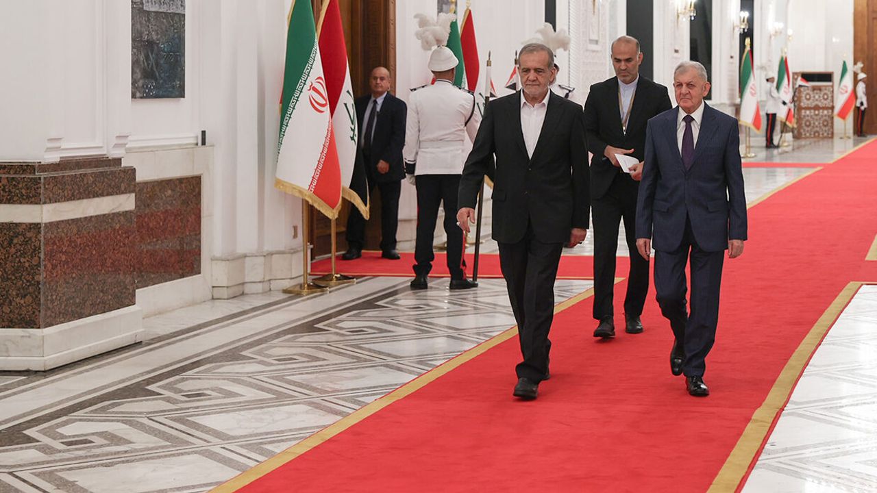 Irak Başbakanı Muhammed Şiya Sudani'nin daveti üzerine ülkenin başkenti Bağdat'a gelen Pezeşkiyan, Uluslararası Bağdat Havaalanında Başbakan Sudani tarafından resmi törenle karşılandı.