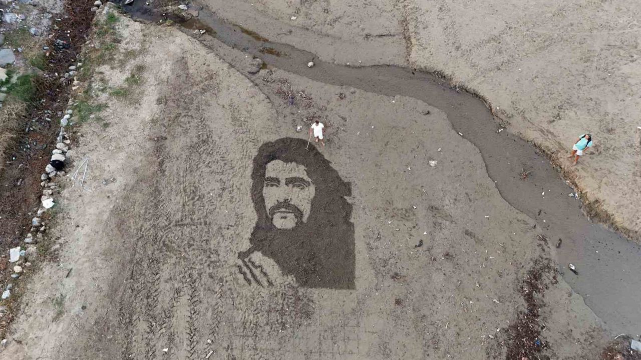 Kumun doğal dokusunu tuval gibi kullanan sanatçı, Barış Manço’nun karakteristik yüz hatlarını ve saç detaylarını büyük bir özenle işledi. Çalışma tamamlandıktan sonra, sahilde yürüyen vatandaşlar ve turistler dev portreyi ilgiyle izleyerek cep telefonlarıyla fotoğraf çekti.
