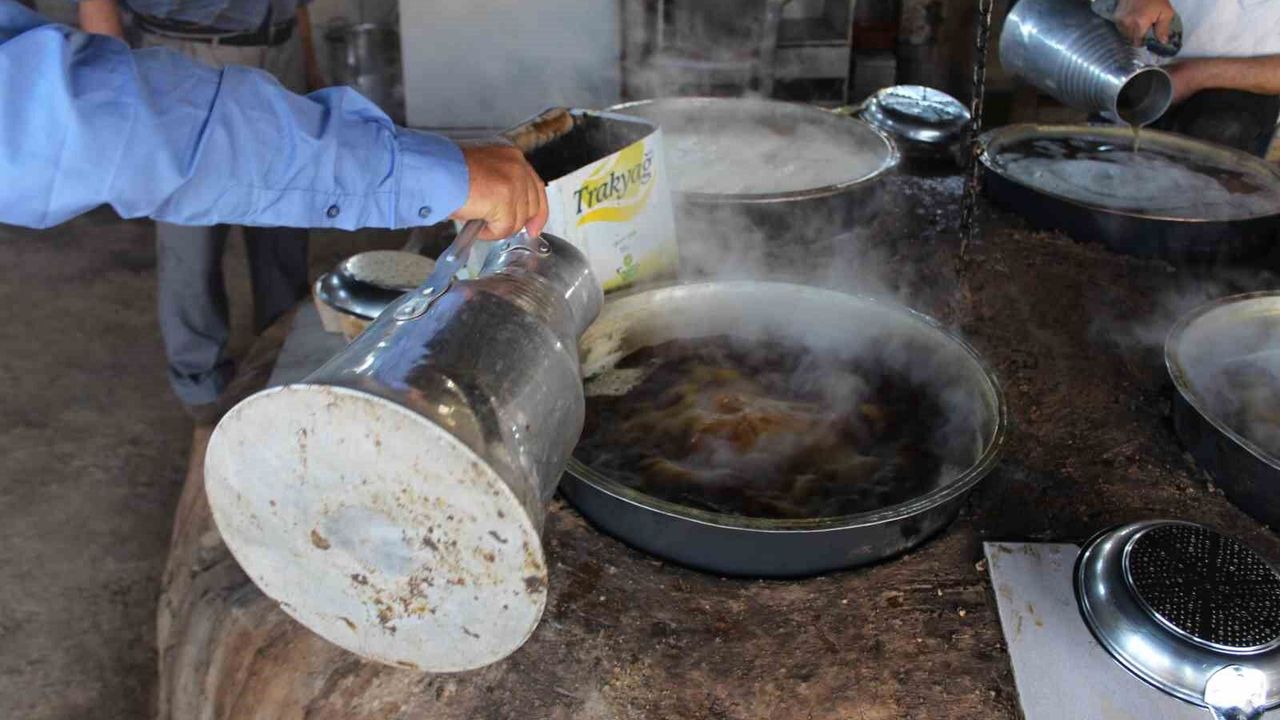 Pekmez yapımını anlatan üretici Mahmut Tanrıyatapan; ‘’Önce üzümleri ezerek suyunu çıkarıyoruz. Ondan sonra öndeki kazana alarak kaynatıyoruz. Üzerinde oluşan köpüğü alarak sürahilere bırakıyoruz. Sürahilerden süzerek buraya getirip tekrar yaklaşık bin 500 derecede kaynatıyoruz.’’ dedi.