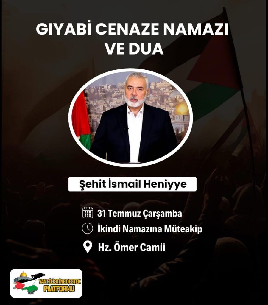 Van Filistin’e Destek Platformu tarafından bugün ikindi namazından sonra Hazreti Ömer Camiinde kılınacak gıyabi cenaze namazı ve duanın ardından basın açıklaması yapılacak.