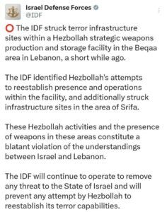 Orta Doğu'daki katliamlarını sürdüren İsrail, bir kez daha Lübnan’ı hedef aldı. İsrail Savunma Kuvvetleri’nden (IDF) yapılan açıklamada, Lübnan'ın Bekaa bölgesinde bulunan Hizbullah’a ait silah üretim ve depolama tesislerine saldırı düzenlendiği bildirildi. Ayrıca Lübnan’ın güneyindeki Srifa bölgesinde bulunan altyapı tesislerinin hedef alındığı aktarıldı. Hizbullah’ın söz konusu tesislerde yeniden varlık gösterme girişiminde bulunduğu belirtilen açıklamada, bu girişimlerin İsrail ile Lübnan arasında varılan mutabakatların ihlali anlamına geldiği savunuldu. Açıklamada, "IDF, İsrail’e yönelik her türlü tehdidi ortadan kaldırmak için operasyonlarına devam edecek. Hizbullah'ın terör kapasitesini yeniden kazanmasına yönelik her türlü girişimini engelleyeceğiz" denildi.