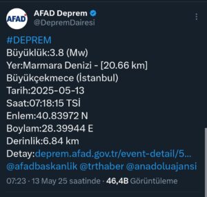 Afet ve Acil Durum Yönetimi Başkanlığı'ndan (AFAD) alınan bilgiye göre, saat 07.18'de merkez üssü Marmara Denizi Büyükçekmece açıkları olan 4.3 büyüklüğünde deprem kaydedildi. Sarsıntı yerin 6.84 kilometre derinliğinde meydana geldi.