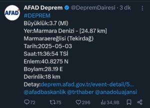 Afet ve Acil Durum Yönetimi Başkanlığı (AFAD) internet sitesinde yer alan bilgiye göre, merkez üssü Marmara Denizi olan 3,7 büyüklüğünde bir deprem meydana geldi.